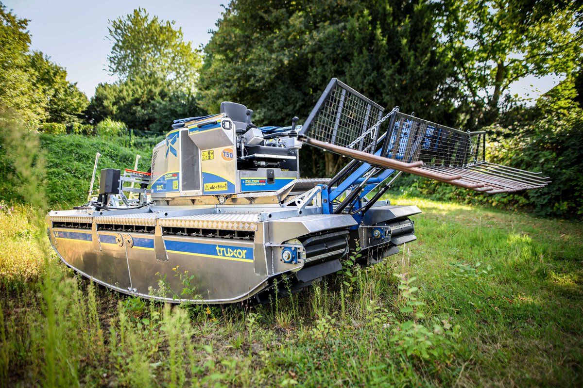 Der sonnige Mai 2023 hatte die Wasserpflanzen im See des Stadtgarten Essen explosionsartig wachsen lassen. Deshalb wurde der zugewucherte See erfolgreich entkrautet und zeigt sich wieder von seiner natürlichen Seite. Erneut zeigte der Truxor, dass er mit seinem Kettenantrieb und dem geringen Bodendruck Arbeiten uferschonend ausübt.